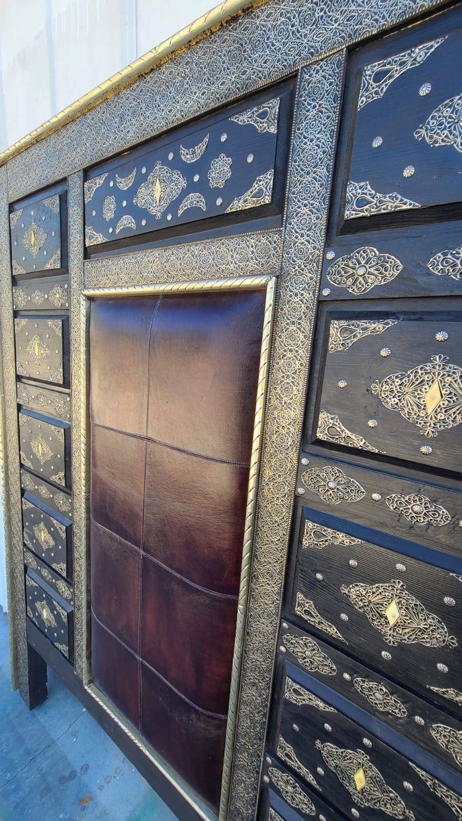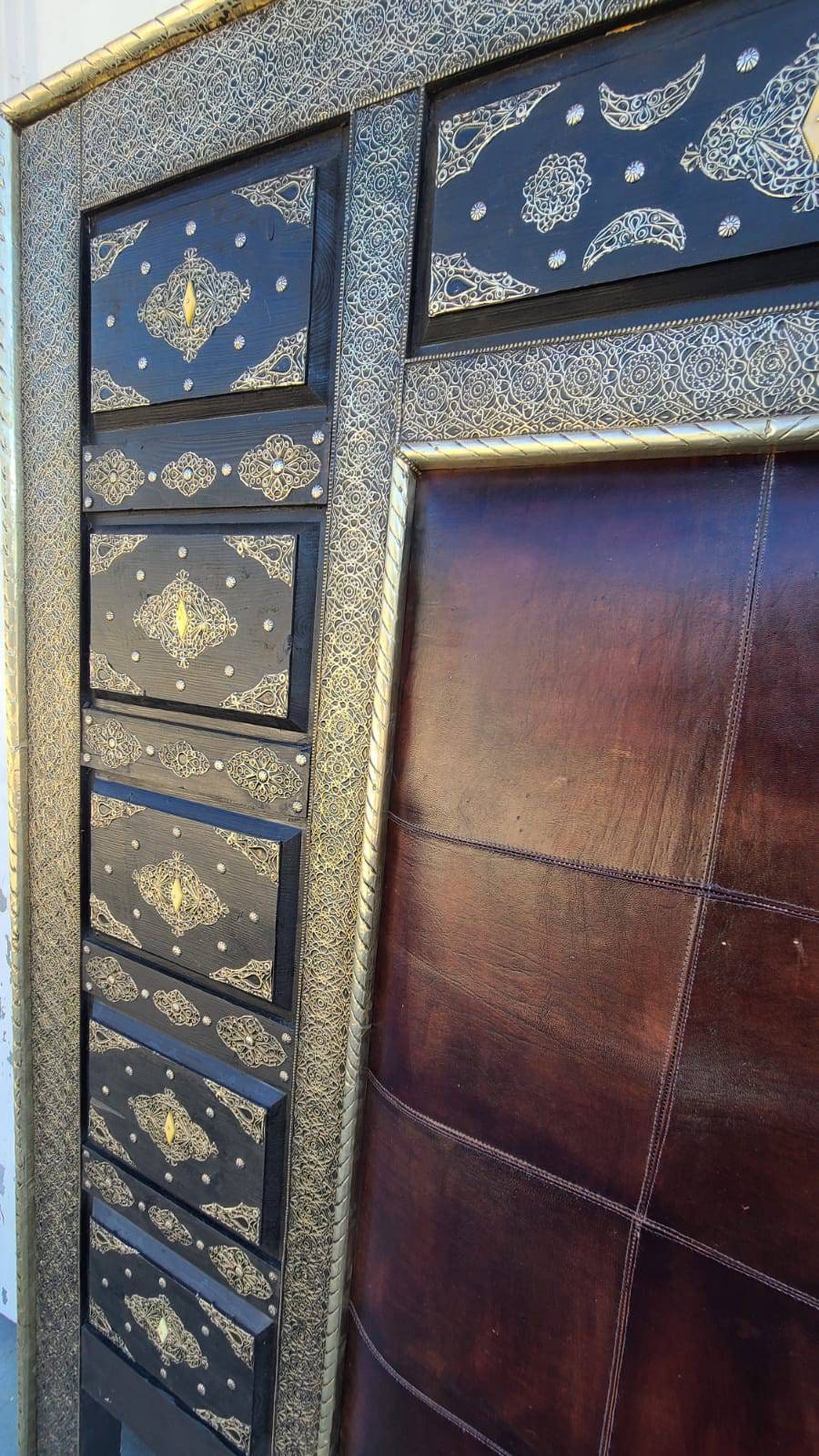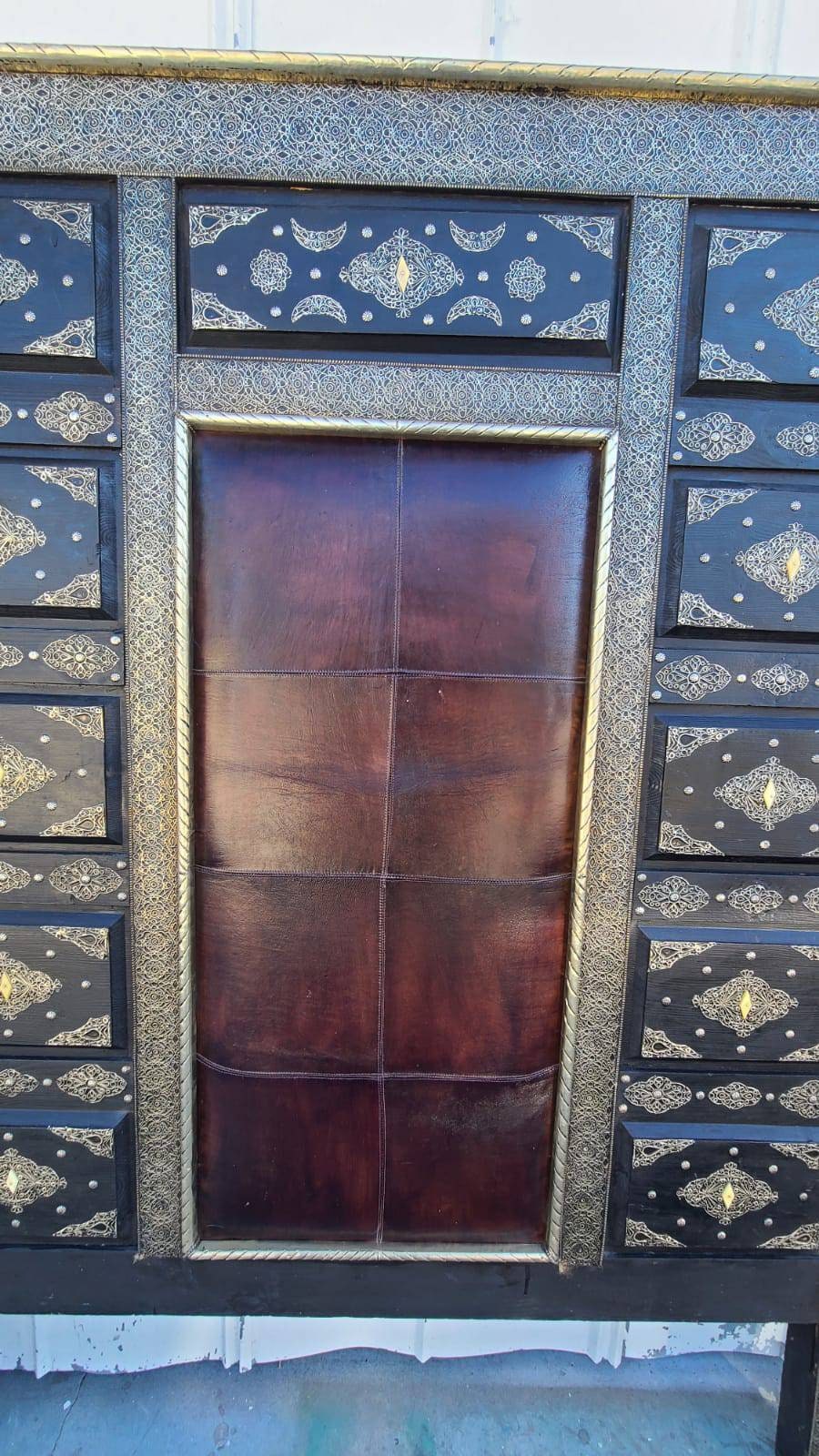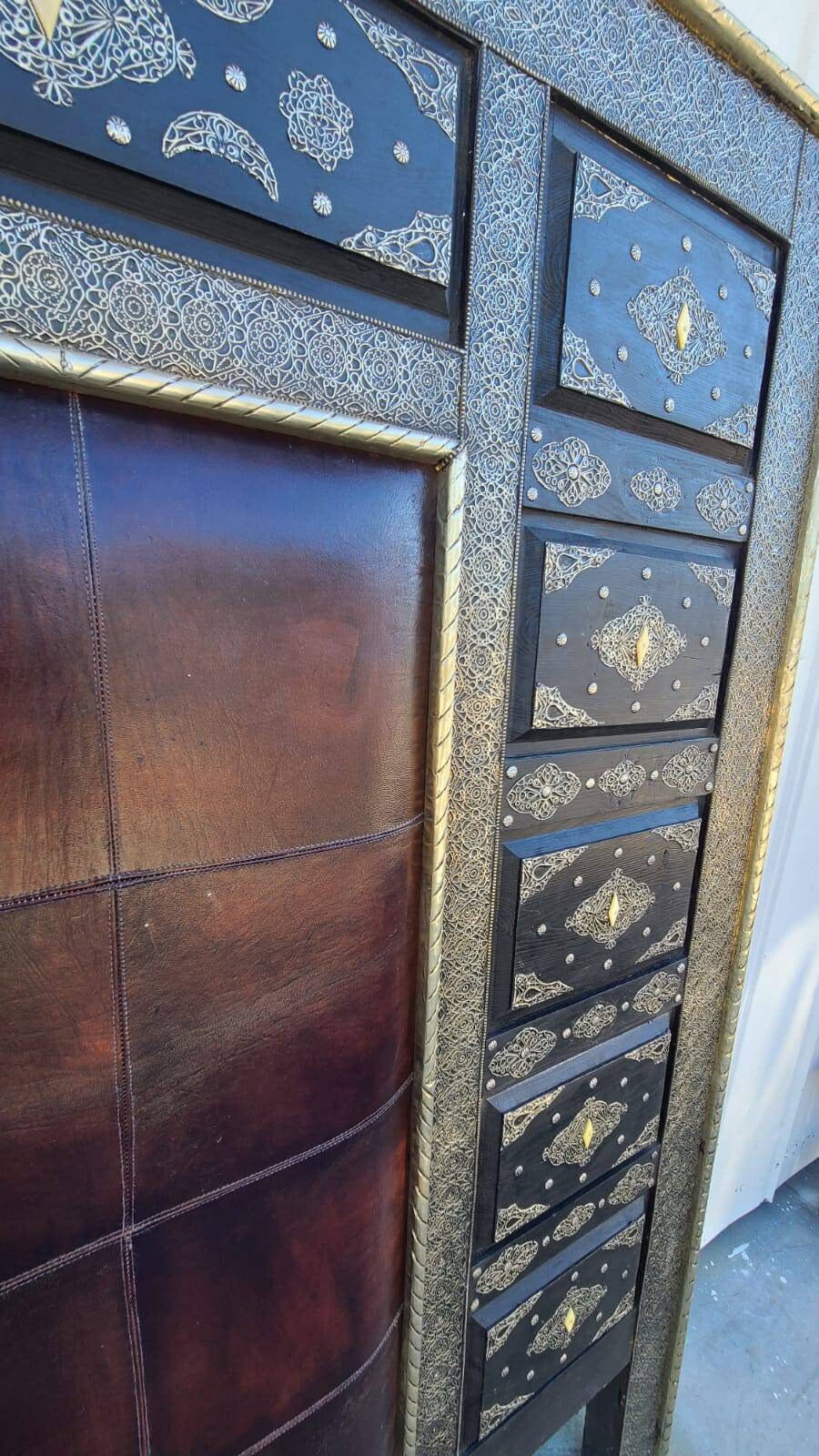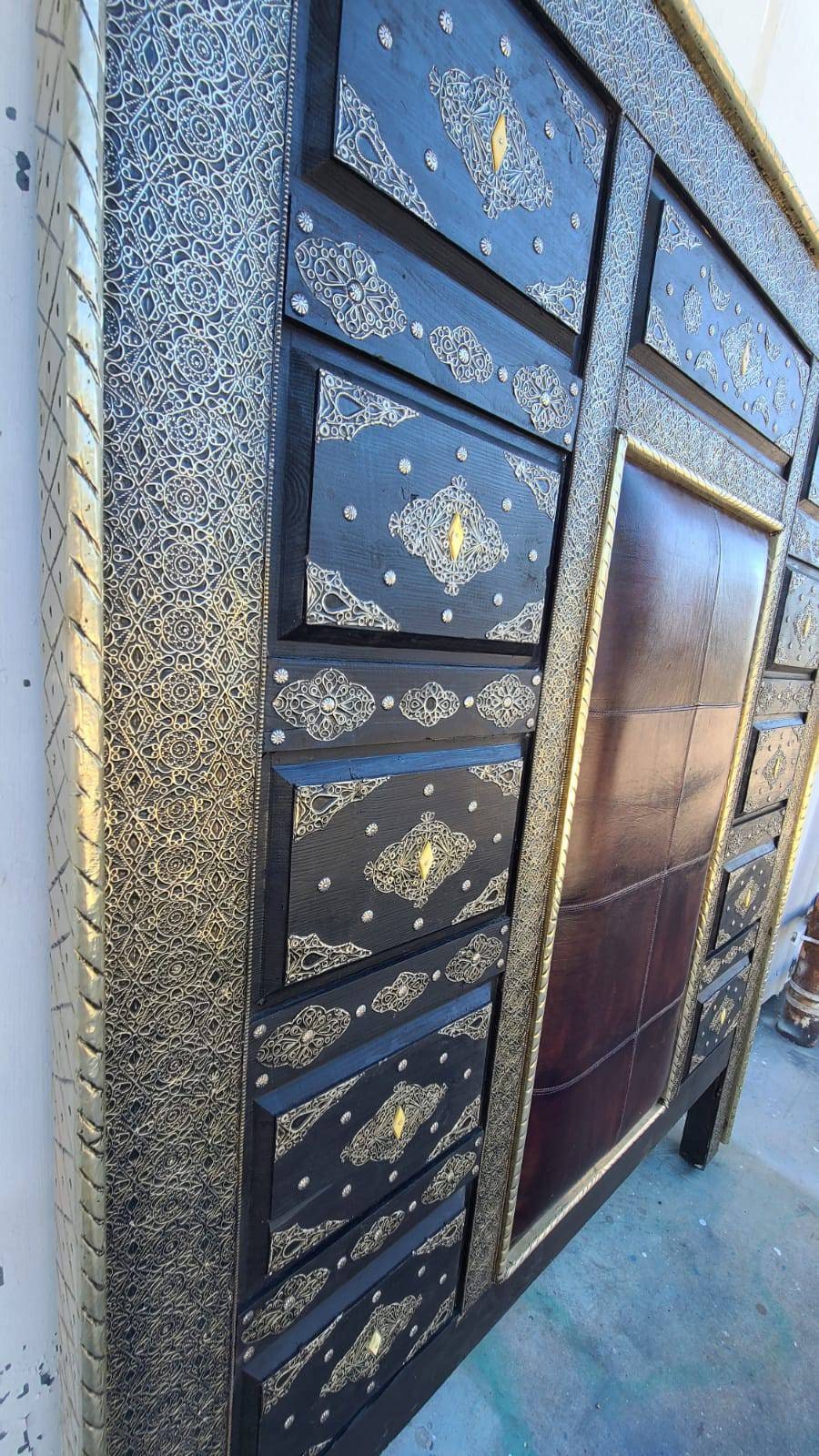 Eclectic moroccan bed leather with silver metal artwork and bone handmade bedding bedroom furniture middle eastern home decor