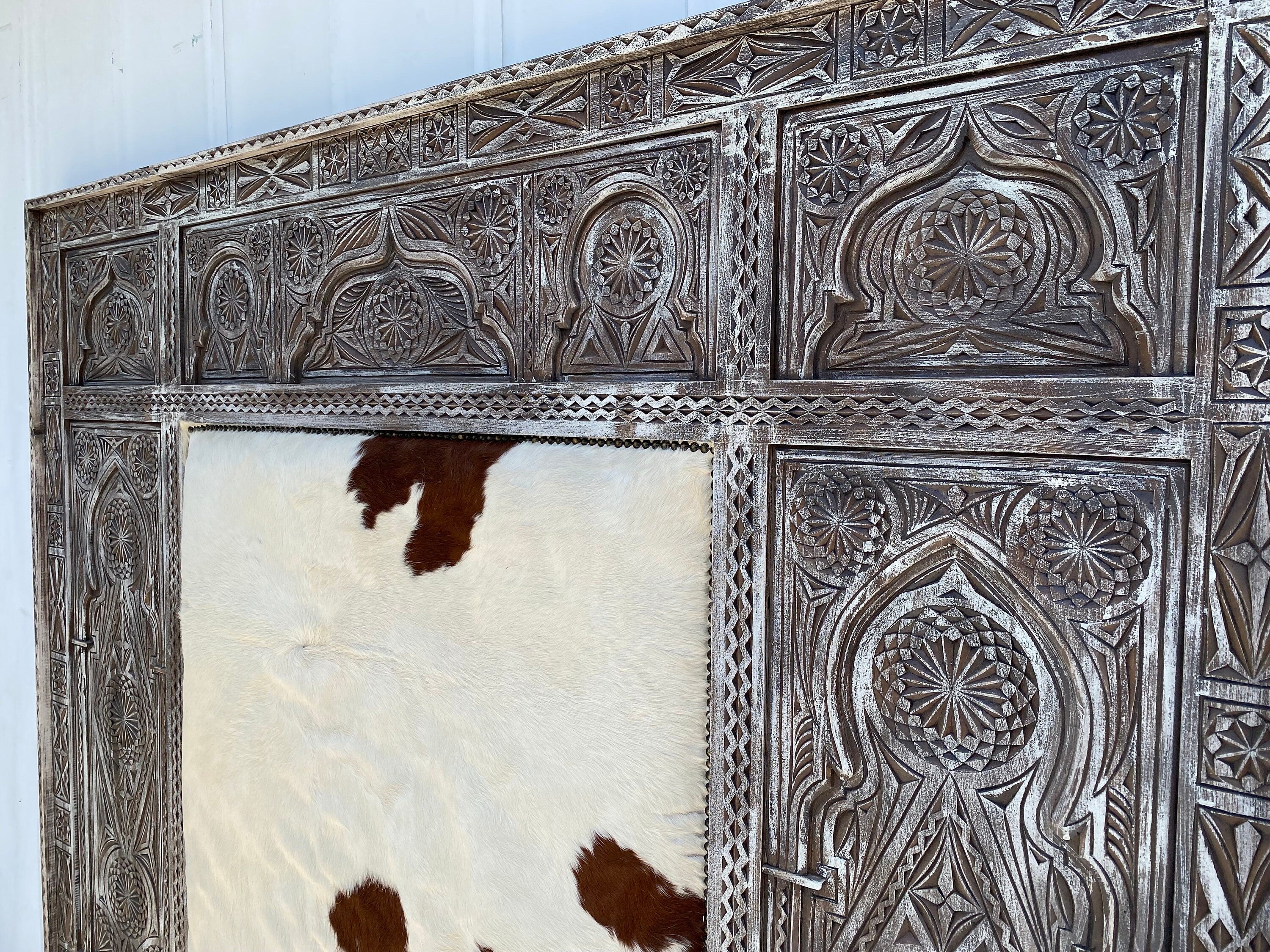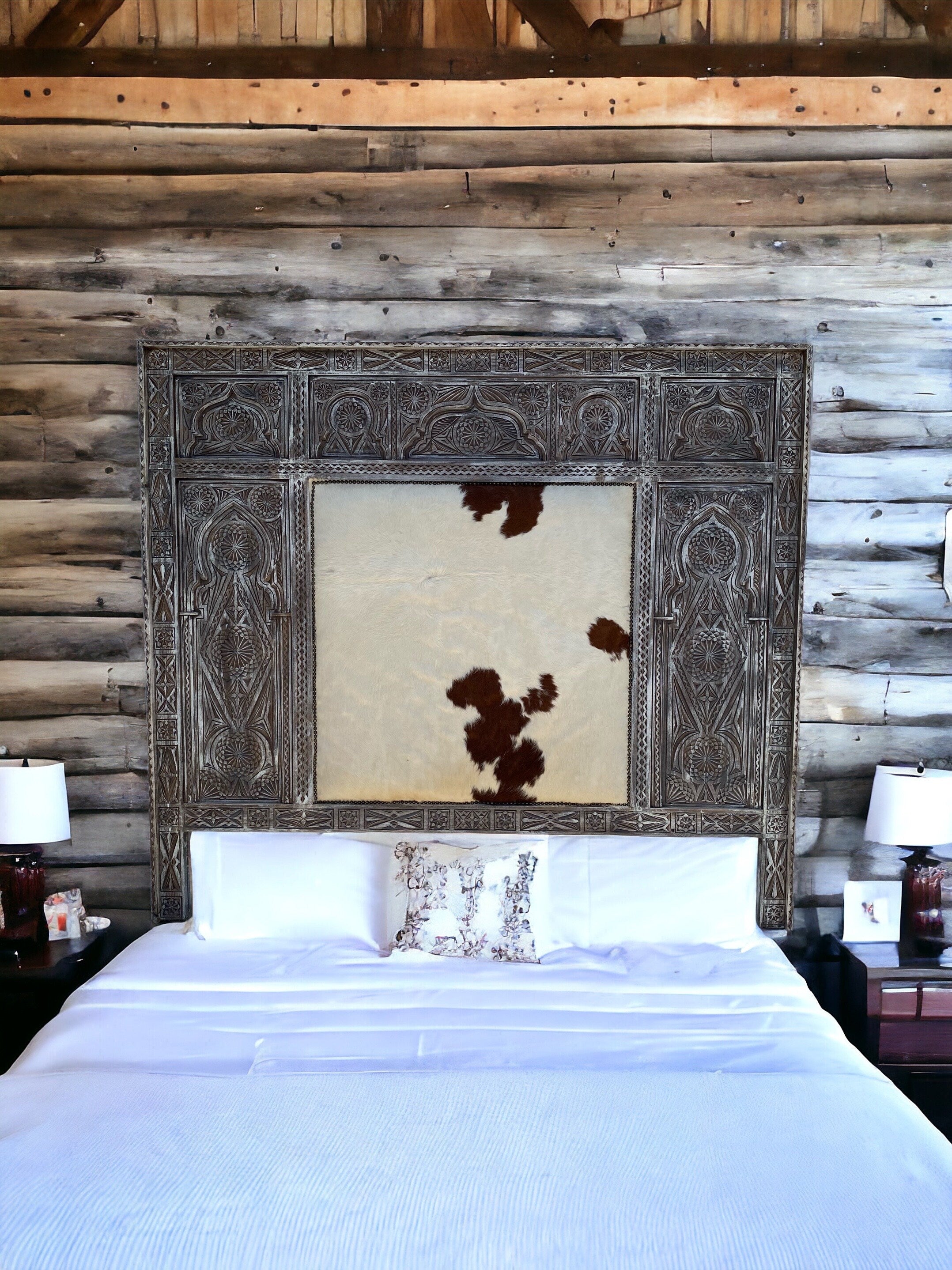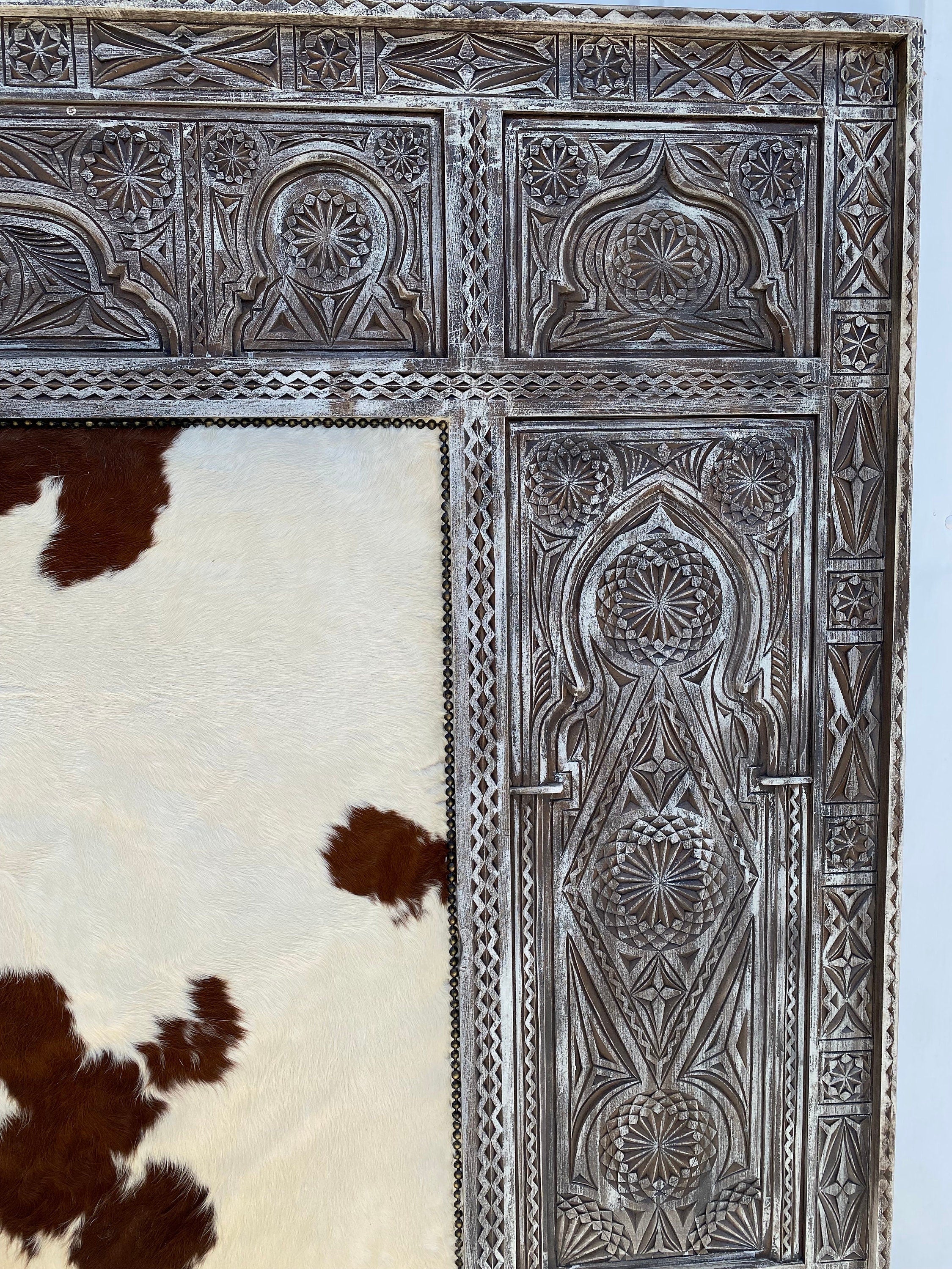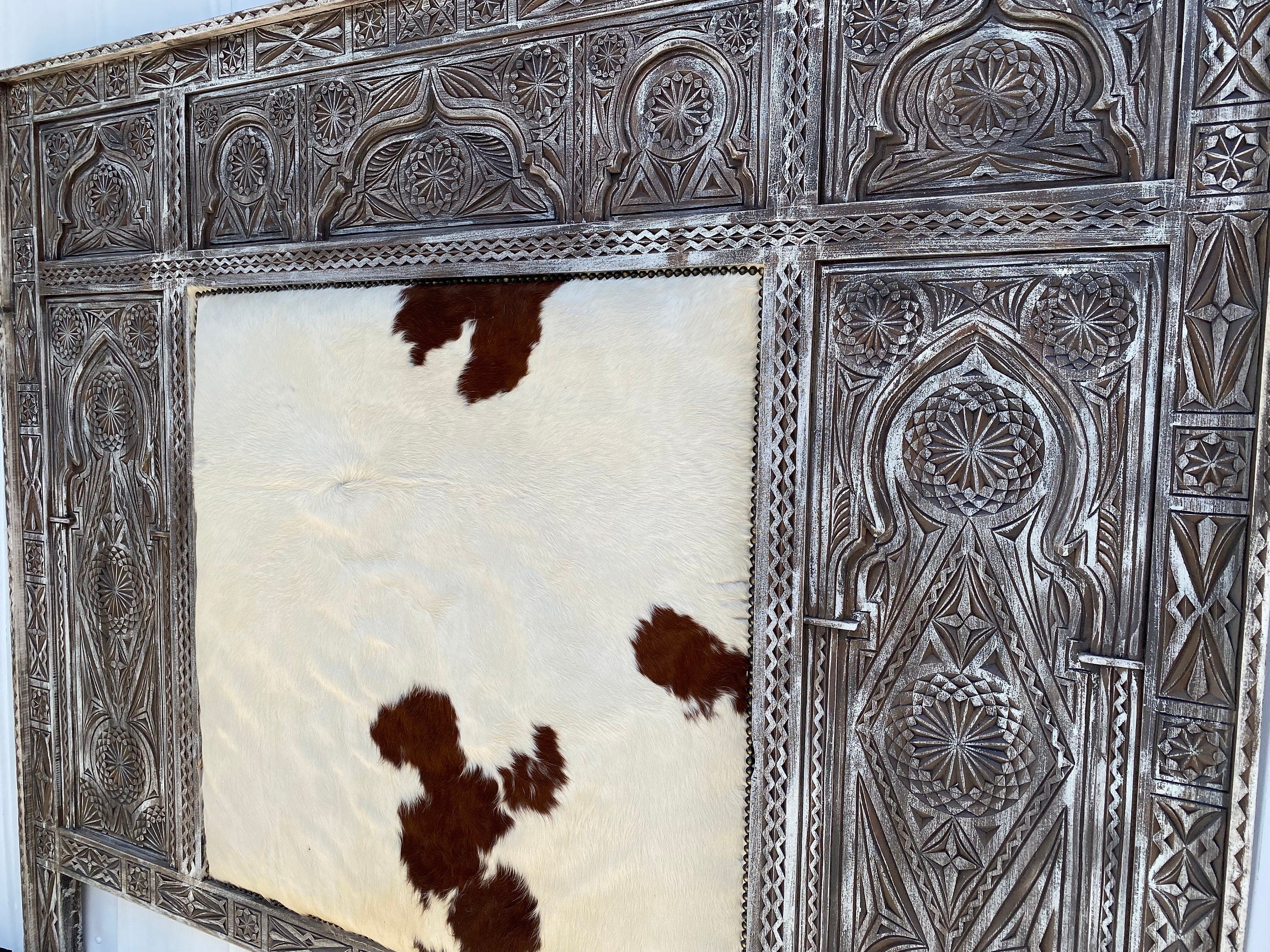 Moroccan cowhide carved headboard bed | A mix culture theme in this beautiful & unique piece of furniture