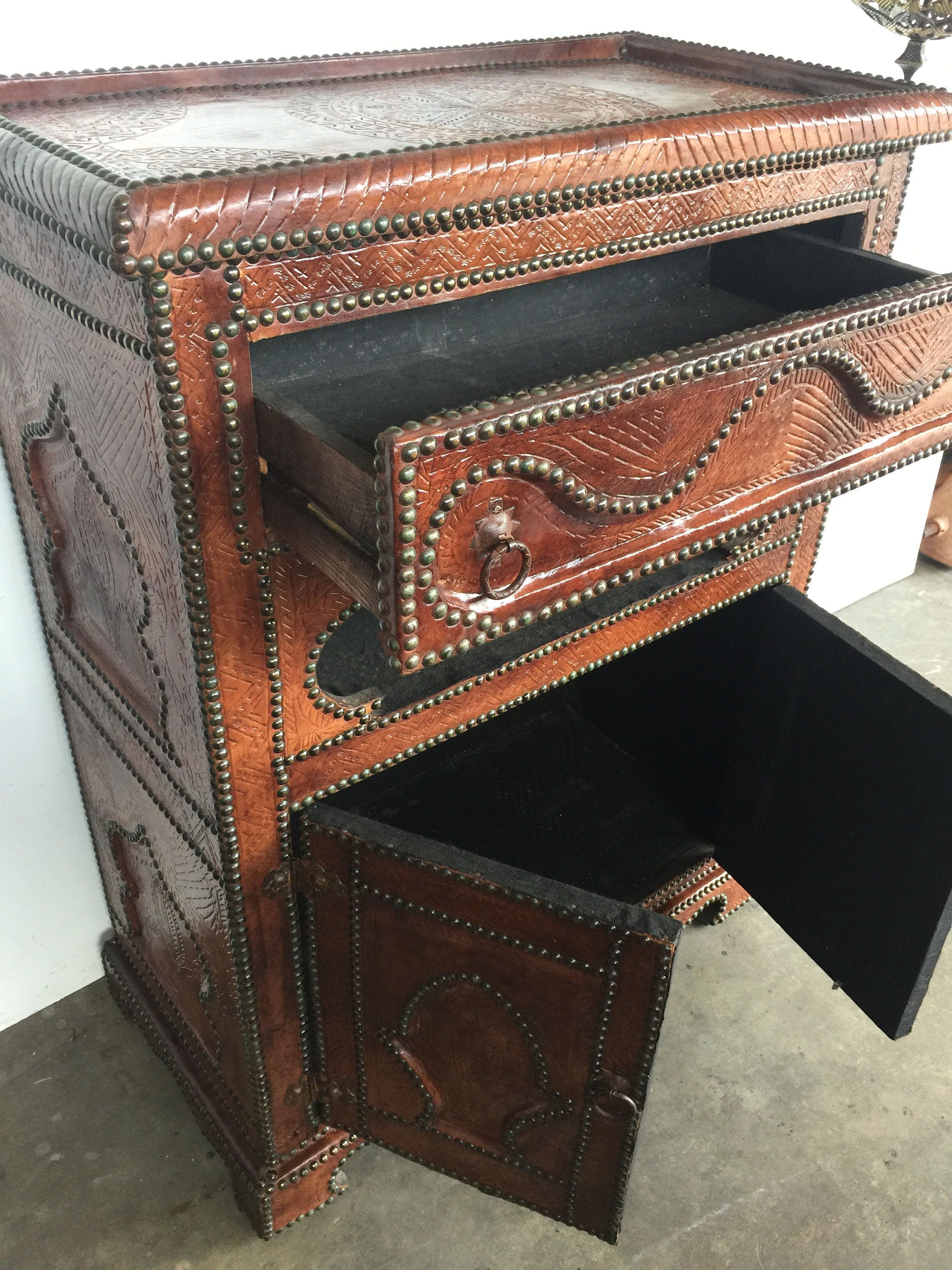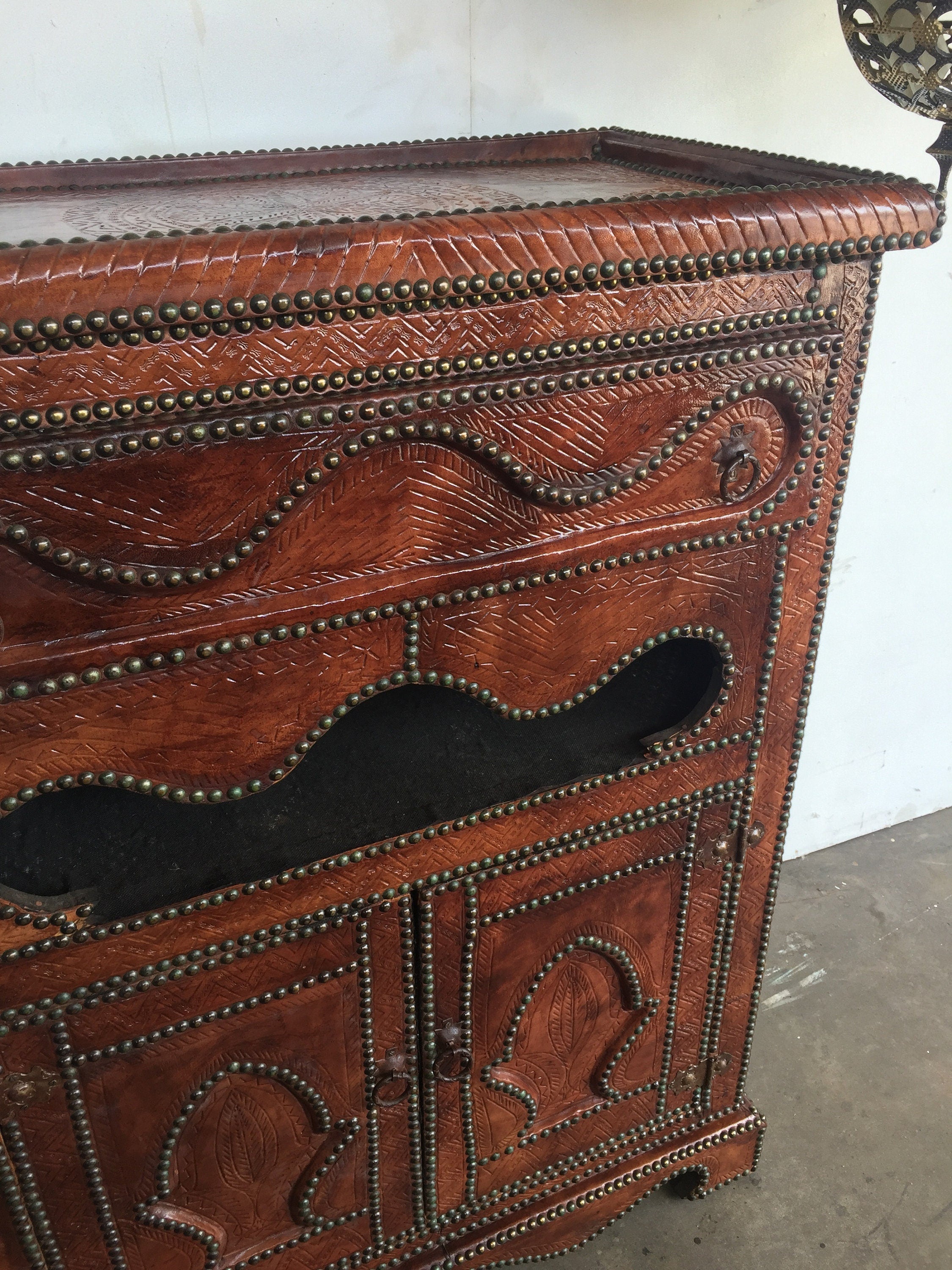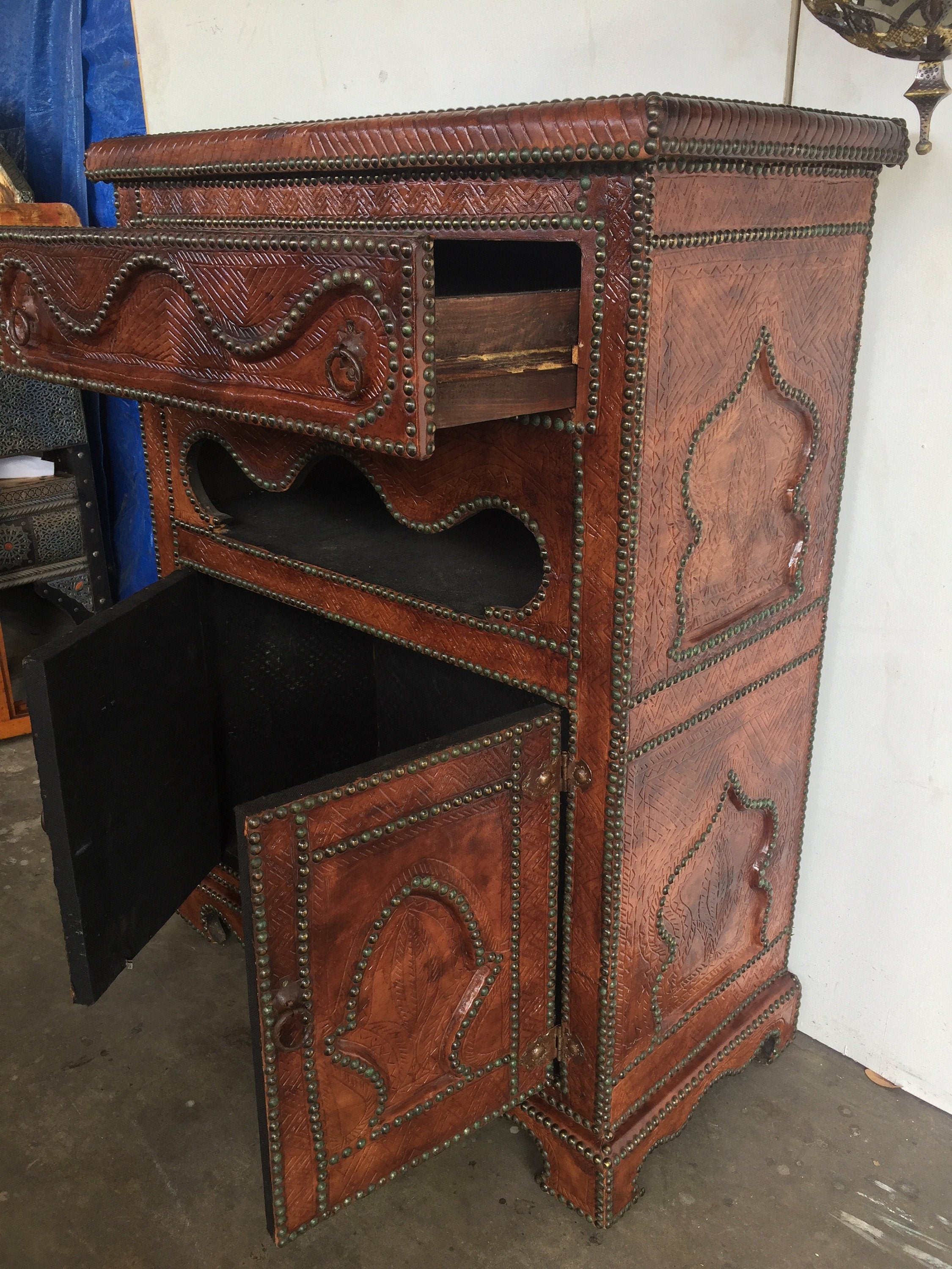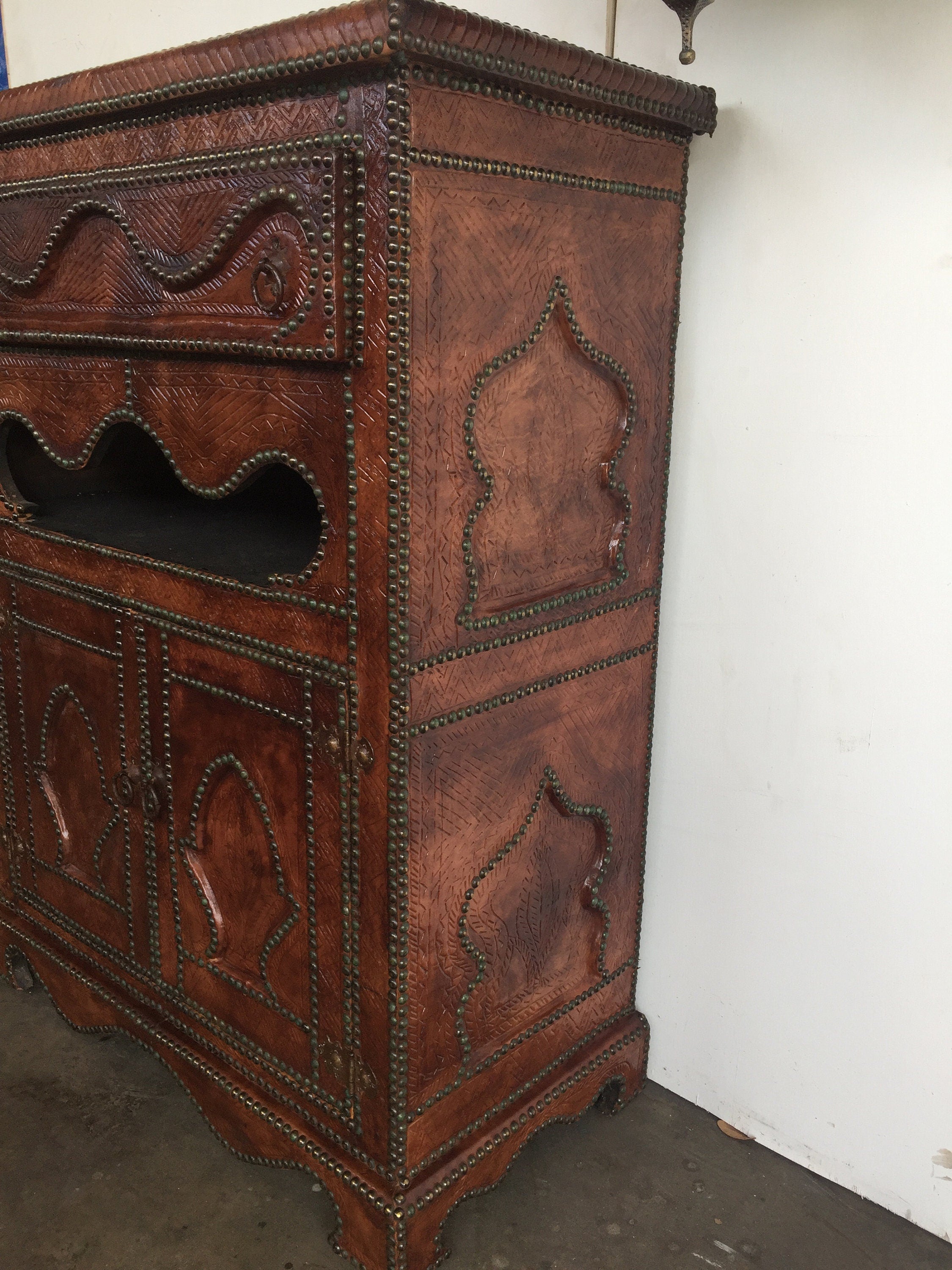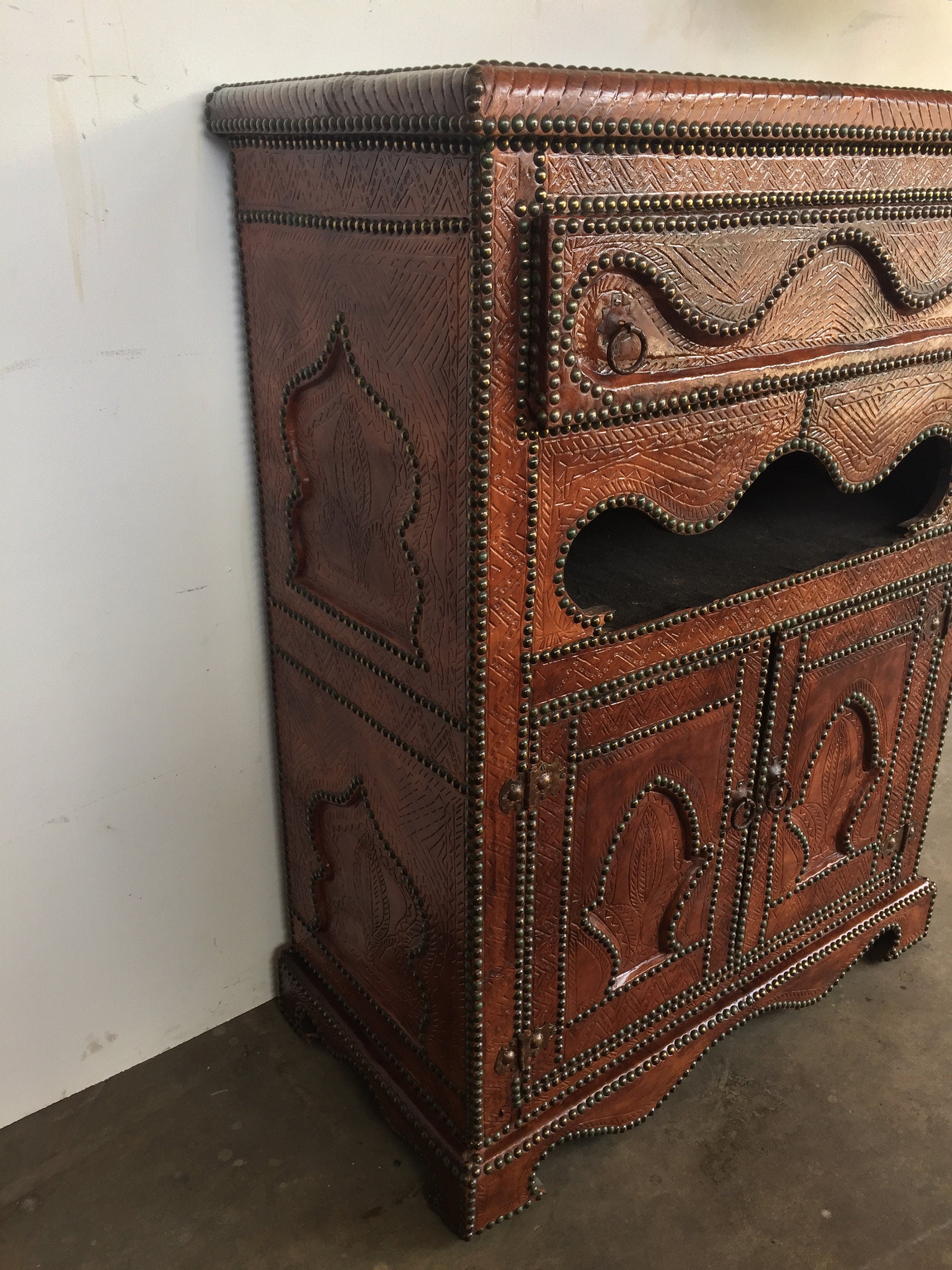 An exotic moorish influence leather cabinet, dressed with tight leather and adorned with hand tooled antique brass umbrella nails, contemporary moroccan style furnishing.