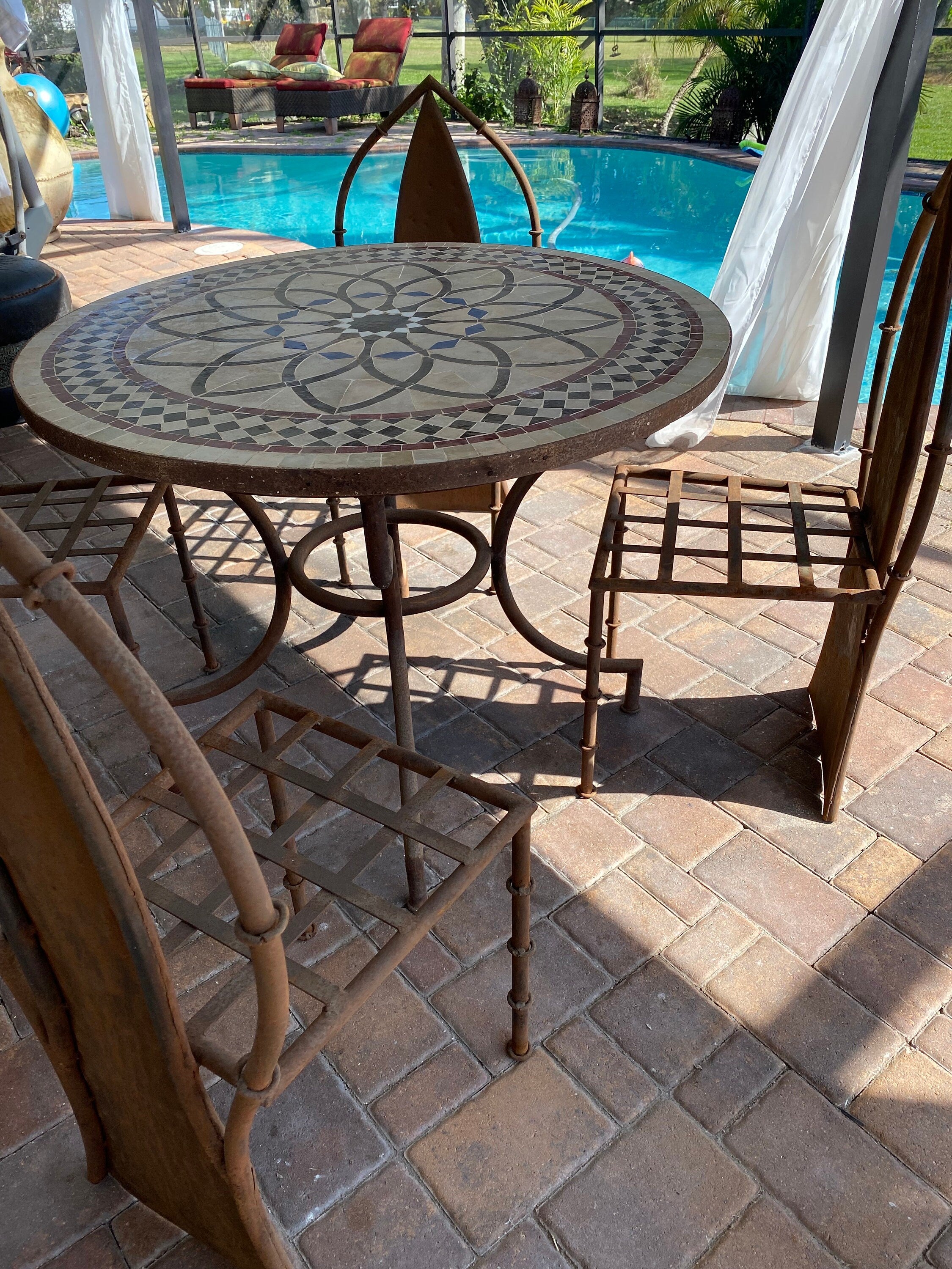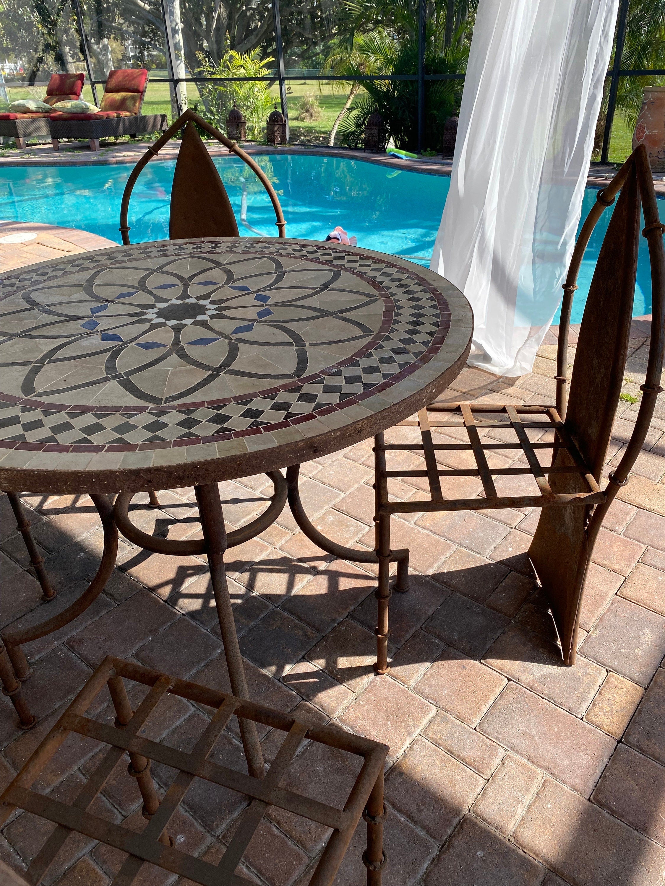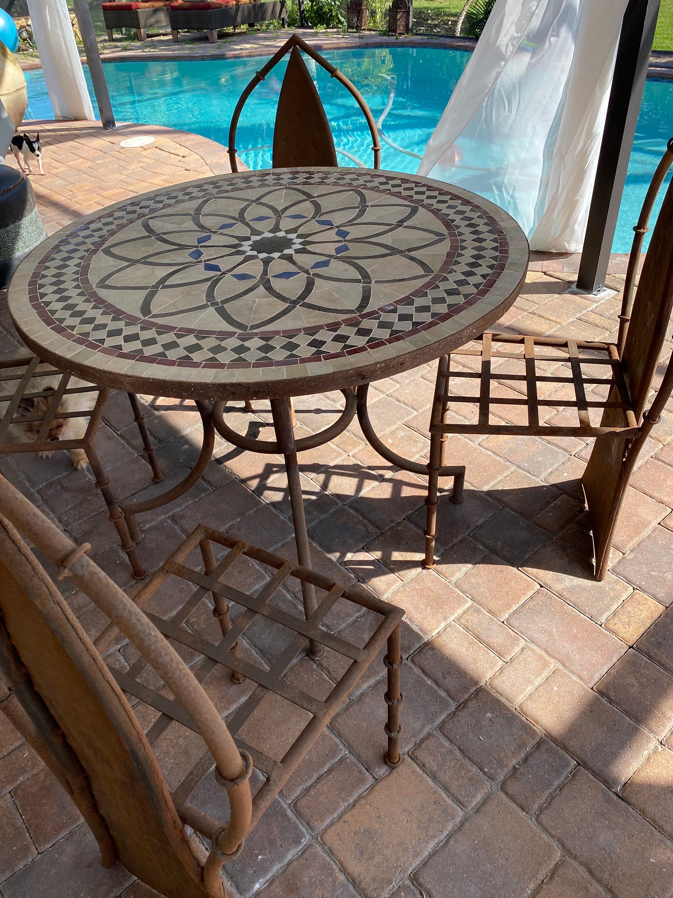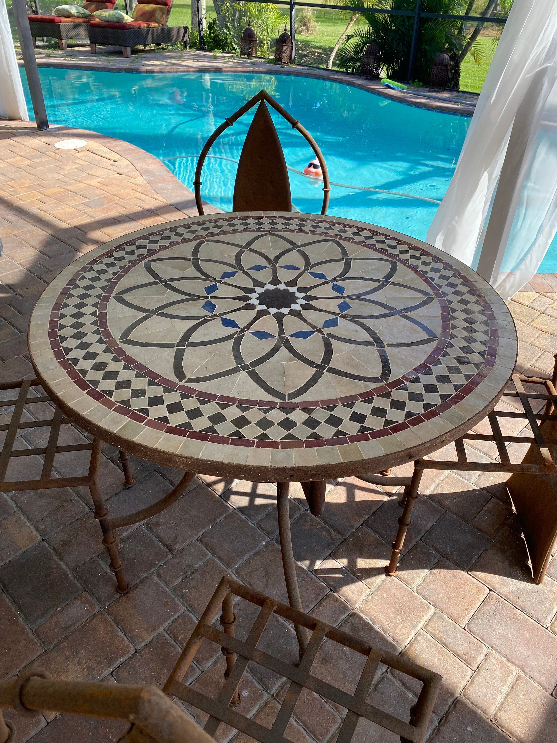 An outdoor moroccan mosaic tile table handmade and chiseled glazed clay table with rustic wrought base patio swimming pool area table