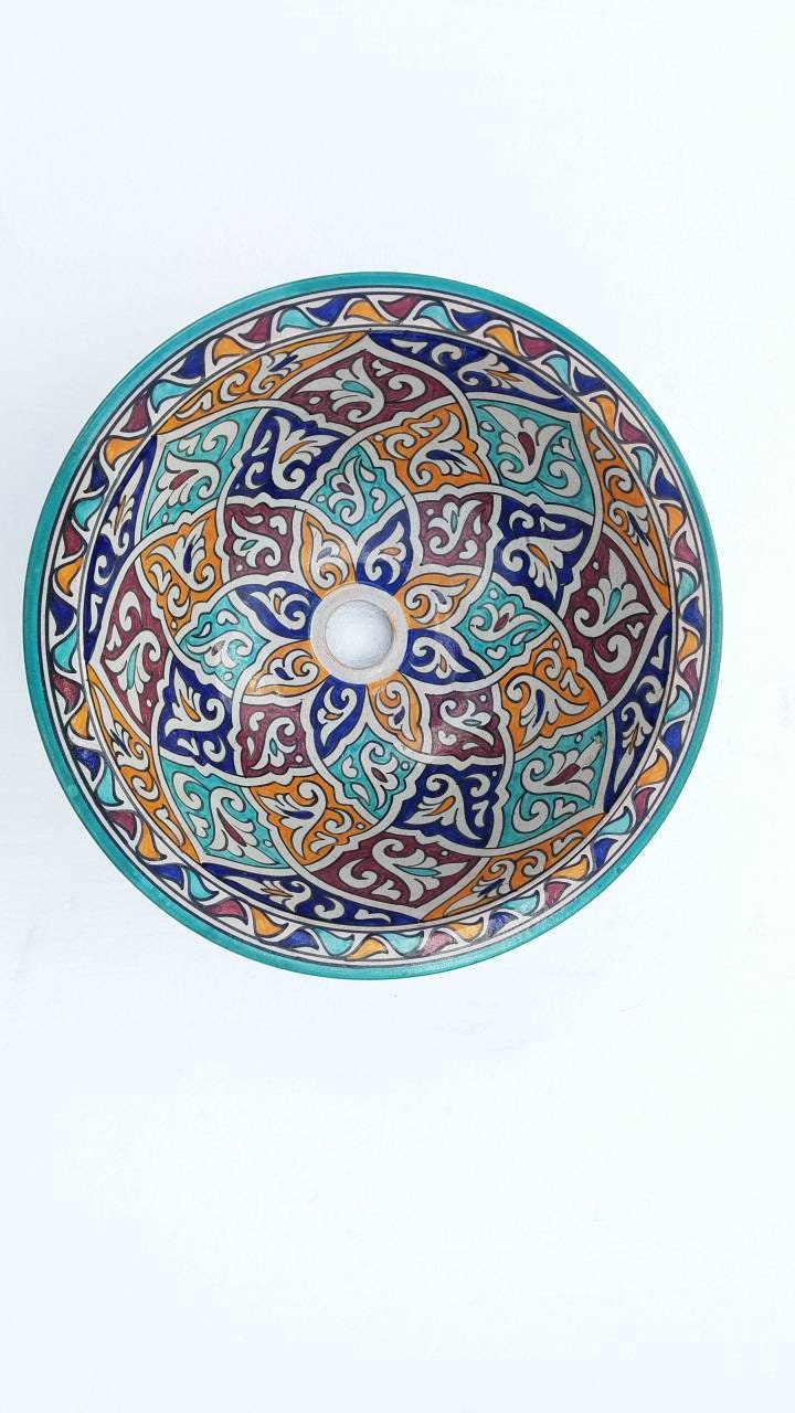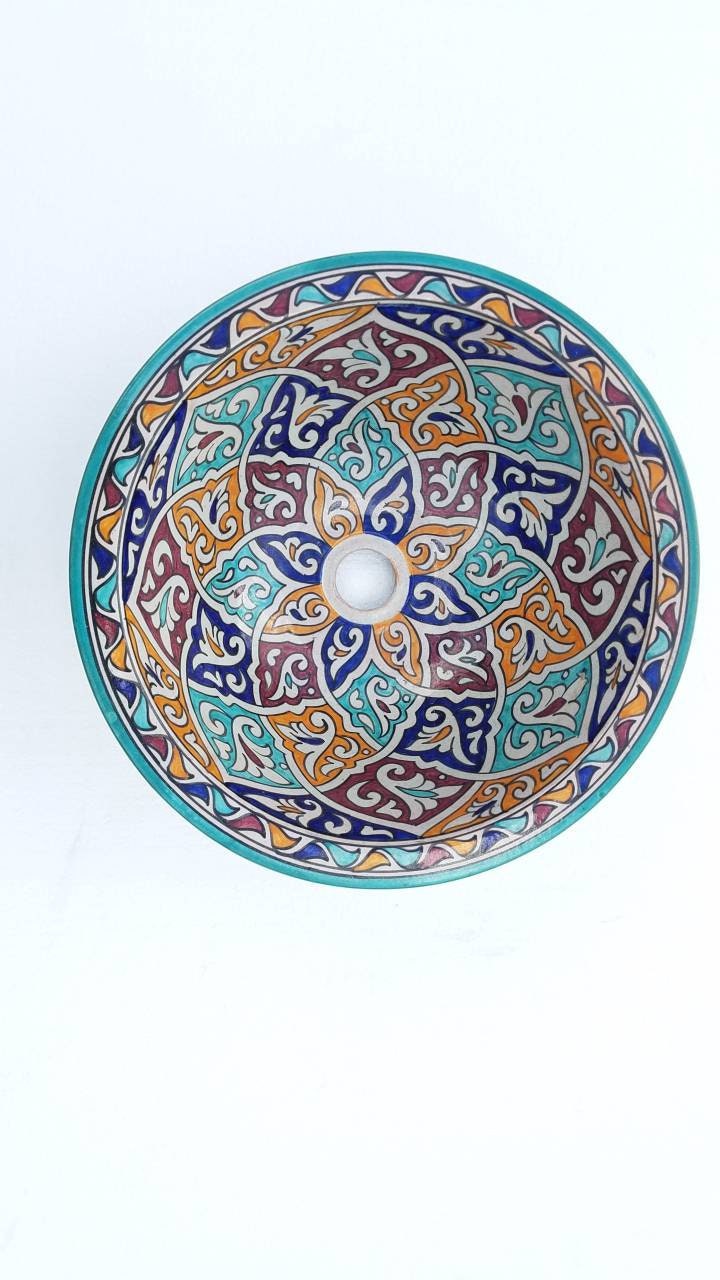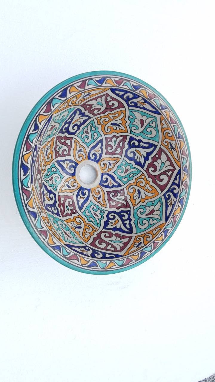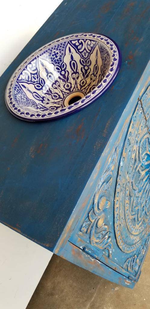 FEZ Handmade Moroccan bathroom sink vanity clay pottery wash basin. Give your bathroom cabinet a moorish hand painted andalusian sink look